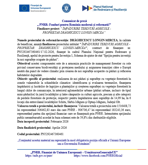 Finalizare proiect: ” ÎMPĂDURIRE TERENURI AGRICOLE – PROPRIETAR DRĂGHICESCU LONGIN-MIRCEA ”Numele proiectului de reformă/investiție: DRĂGHICESCU LONGIN-MIRCEA, în calitate de beneficiar, anunță finalizarea proiectului intitulat ” ÎMPĂDURIRE TERENURI AGRICOLE – PROPRIETAR DRĂGHICESCU LONGIN-MIRCEA”, contract de finanțare nr. PN5292467360461/17.02.2026, finanțat în cadrul Planului Național pentru Redresare și Reziliență, apelul de proiecte pentru Investiția 1, Schema de ajutor de stat „Sprijin pentru investiții în noi suprafețe ocupate de păduri”.