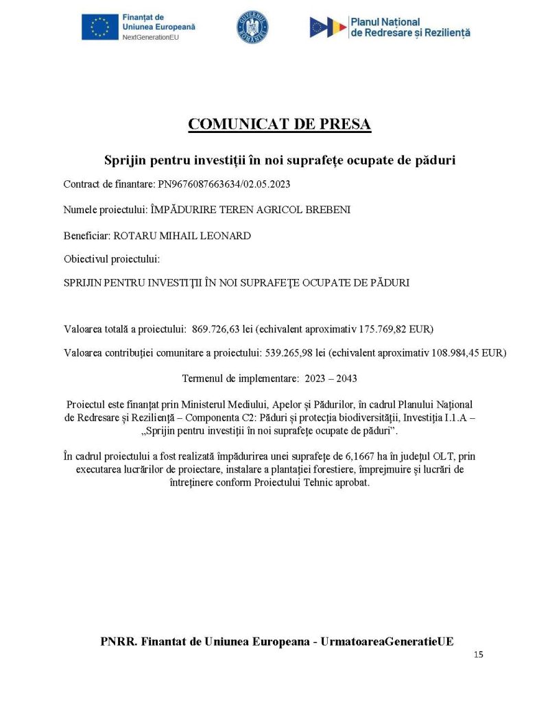 Proiectul este finanțat prin Ministerul Mediului, Apelor și Pădurilor, în cadrul Planului Național de Redresare și Reziliență – Componenta C2: Păduri și protecția biodiversității, Investiția I.1.A – „Sprijin pentru investiții în noi suprafețe ocupate de păduri”.