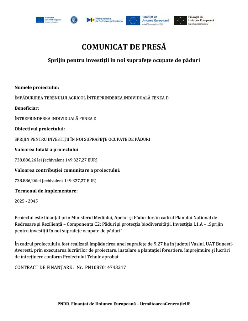 2025 – 2045Proiectul este finanțat prin Ministerul Mediului, Apelor și Pădurilor, în cadrul Planului Național de Redresare și Reziliență – Componenta C2: Păduri și protecția biodiversității, Investiția I.1.A – „Sprijin pentru investiții în noi suprafețe ocupate de păduri”.