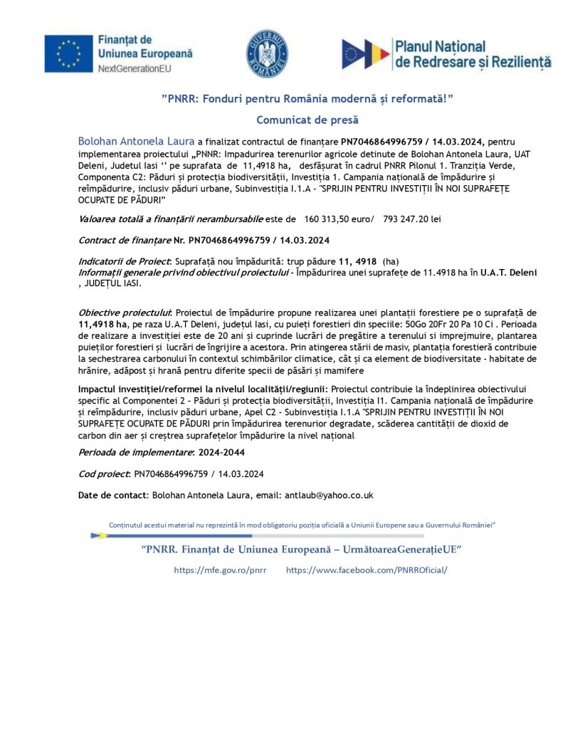 Bolohan Antonela Laura a finalizat contractul de finanțare PN7046864996759 / 14.03.2024, pentru implementarea proiectului „PNNR: Impadurirea terenurilor agricole detinute de Bolohan Antonela Laura, UAT Deleni, Judetul Iasi ‘’ pe suprafata de 11,4918 ha, desfășurat în cadrul PNRR Pilonul 1. Tranziția Verde, Componenta C2: Păduri și protecția biodiversității, Investiția 1. Campania națională de împădurire și reîmpădurire, inclusiv păduri urbane, Subinvestiția I.1.A – „SPRIJIN PENTRU INVESTIȚII ÎN NOI SUPRAFEŢE OCUPATE DE PĂDURI”