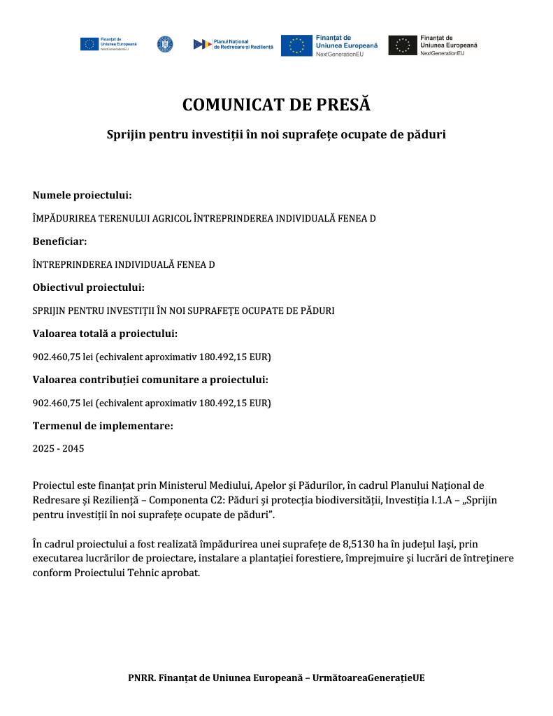 2025 – 2045Proiectul este finanțat prin Ministerul Mediului, Apelor și Pădurilor, în cadrul Planului Național de Redresare și Reziliență – Componenta C2: Păduri și protecția biodiversității, Investiția I.1.A – „Sprijin pentru investiții în noi suprafețe ocupate de păduri”.